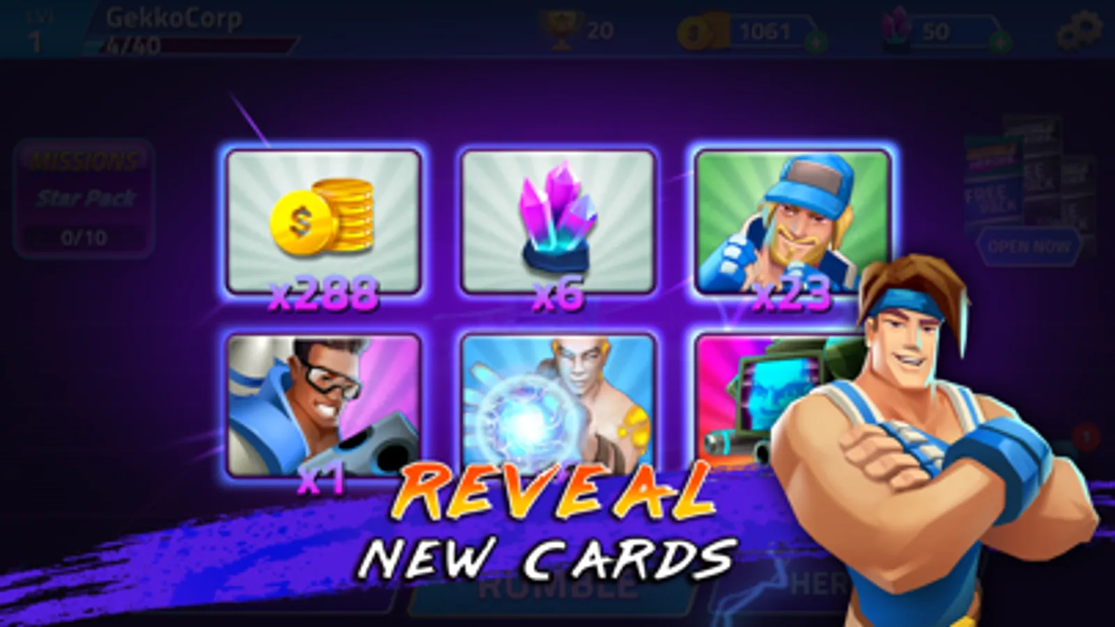 RUMBLE HEROES is a real-time PvP game with an over-the-top 80s arcade vibe. Assemble a team of unique heroes, travel to exotic locations around the world and fight other players for glory & cash!