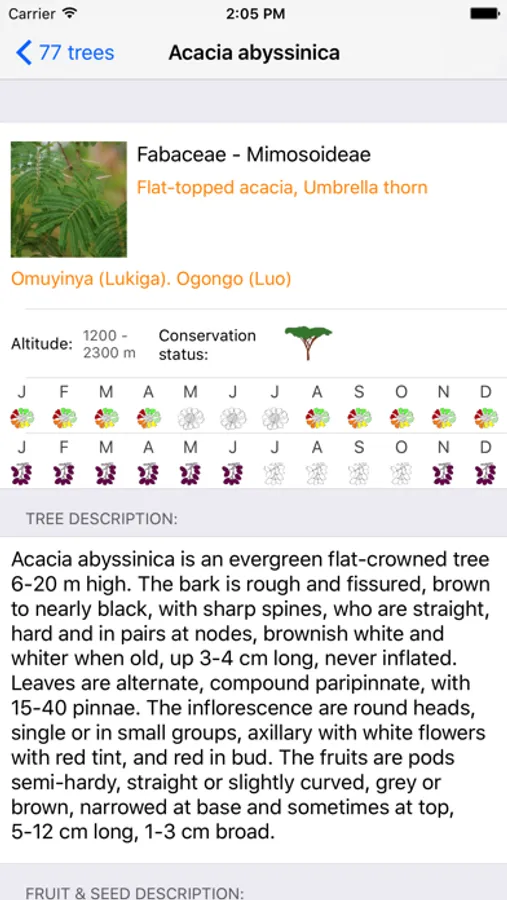 On top: Botanical name, English names, Uganda vernacular names, Simple botanical description, Fruit description, Products and Services to humans and environment, Tree management and last but not the least for easy confirmation one picture of each species.