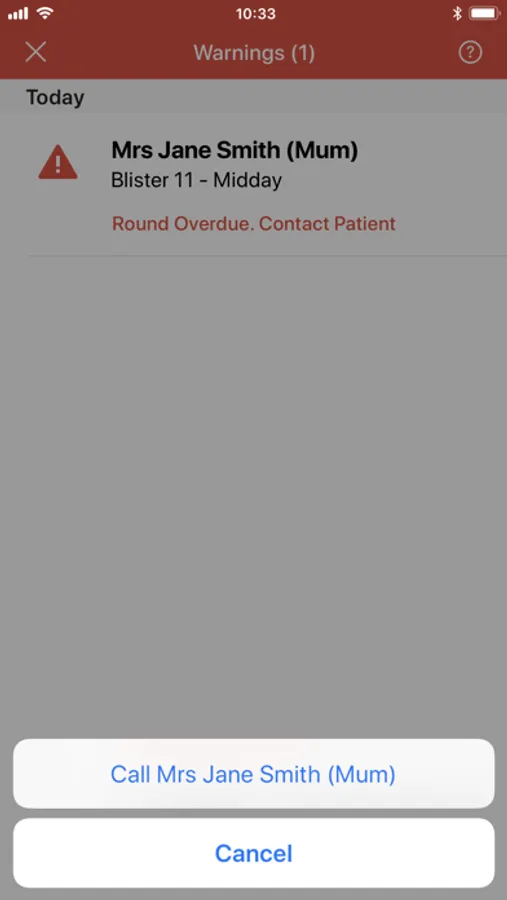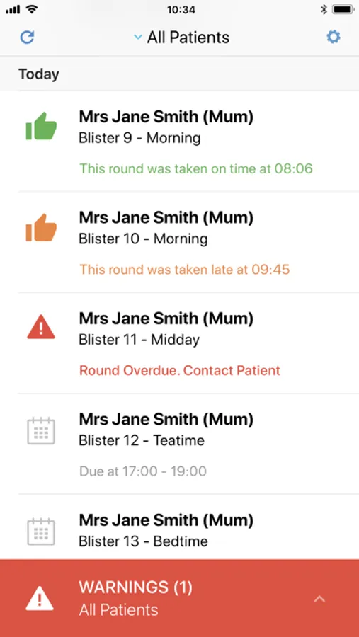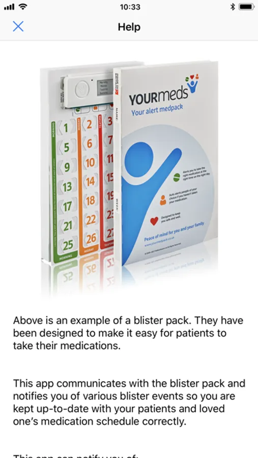The YOURmeds app used with the YOURmeds system (see www.yourmeds.net), reminds patients when to take their medications. If the patient forgets to take their medication, the app will also notify your connected friends and family creating a support network around the patient. Open the app at anytime to view the patient’s taken, overdue and missed events along with the next expected events.
