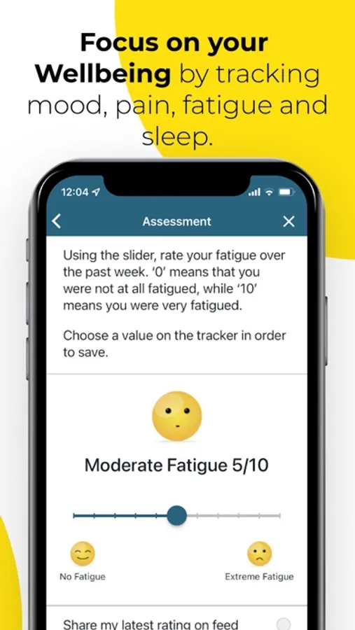 • Share how you’re feeling. Track fatigue, mood, pain and sleep; integrate with health apps and wearables (capturing steps and sleep) and share personalized graphs with your friends and your doctor
