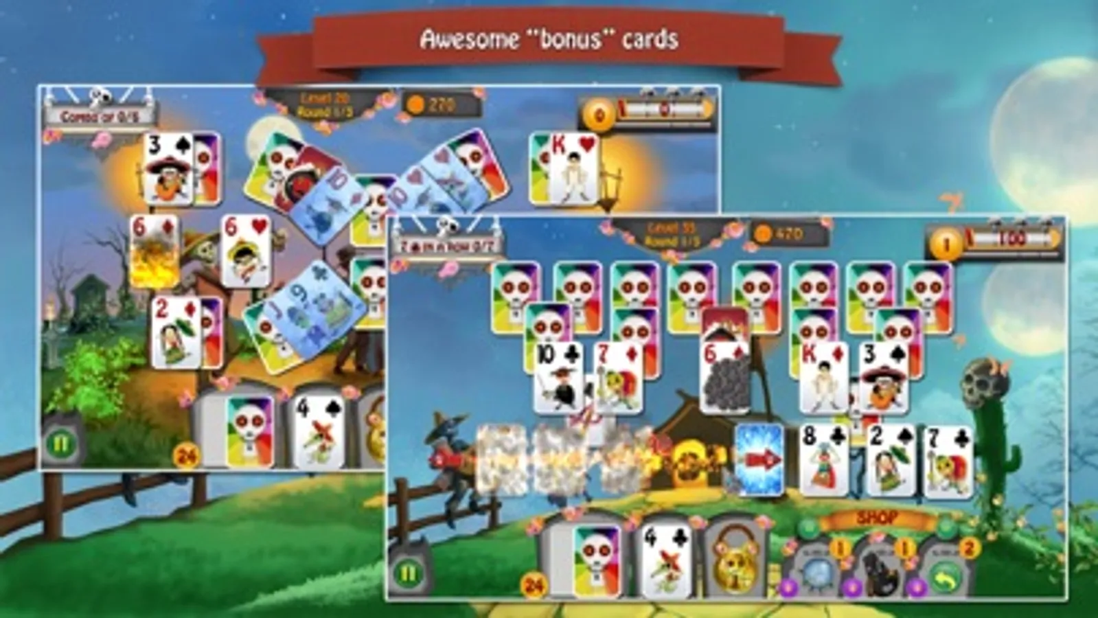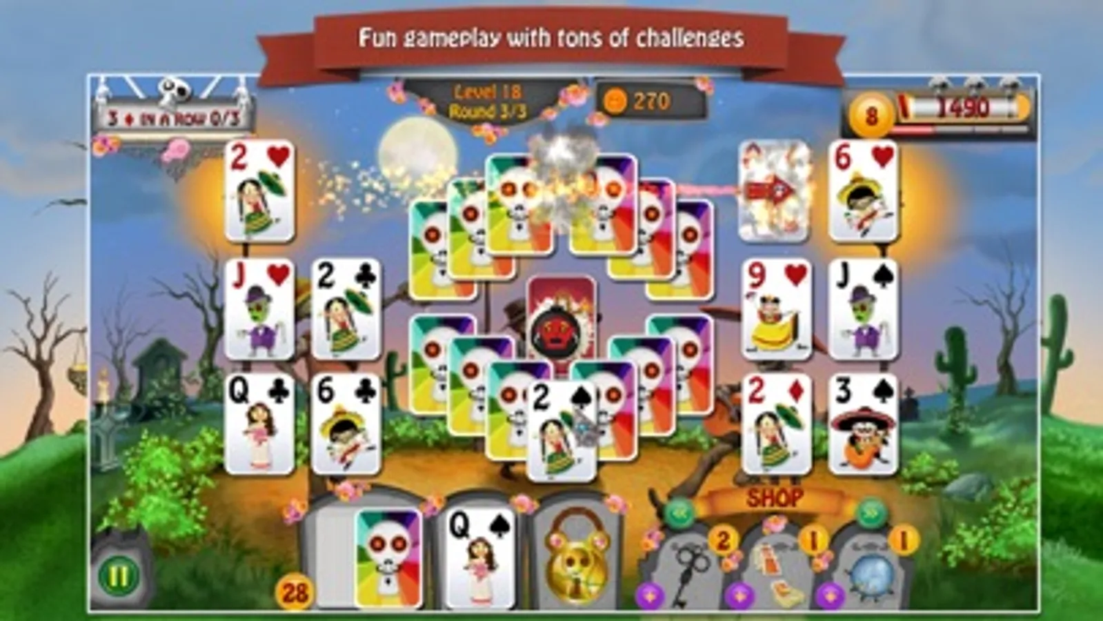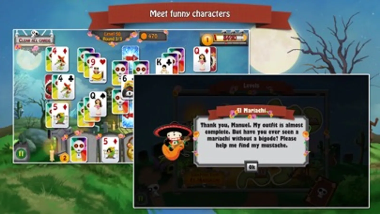 There is an old legend in Mexico that on "Dia de los Muertos" the Day of the Dead, the gates of heaven will open and the souls of our loved ones can visit the land of the living. That's where the story of Manuel and Maria begins. An evil soul has kidnapped Maria. And now Manuel asks for your help to join him in this incredible adventure through the land of the dead after his beloved bride. Journey through beautiful scenery, relaxing music and help funny characters to find their belongings. Prove your skills in this challenging solitaire game!