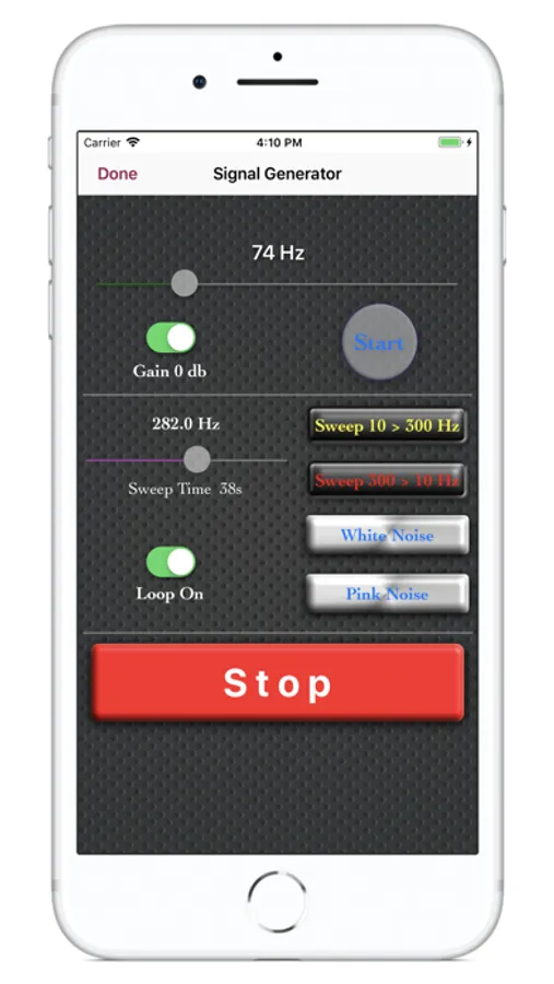 • Control of the single Frequency with the slider from 10Hz to 300Hz, Pink Noise, White Noise, Sweep Frequency 300>10Hz and 10>300Hz, Loop and Gain tones.