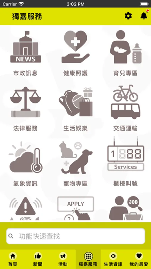 ● 「獨嘉服務」:交通運輸、休閒娛樂、生活資訊、教育學習、健康照護、安全防災、市政訊息、法律服務、優質APP推薦…等多元的資訊。
