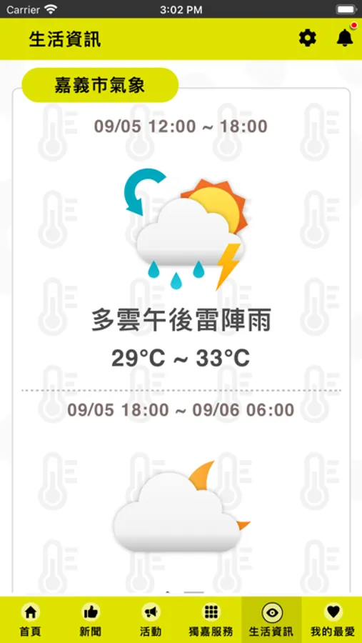 ● 「生活資訊」:整合空氣品質、油價、水庫水位、未來36小時天氣預報…等資訊,讓使用者關心的生活資訊一目了然。