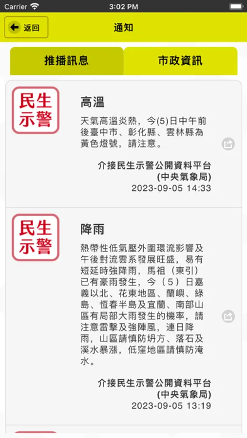 ● 提供「訊息推播」功能,使用者可訂閱「市政資訊」、「民生示警」。