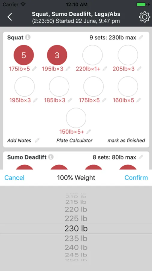 - For 531 programs, the app calculates what weights should be lifted, based on percentages of base weights.