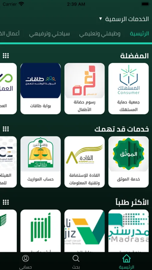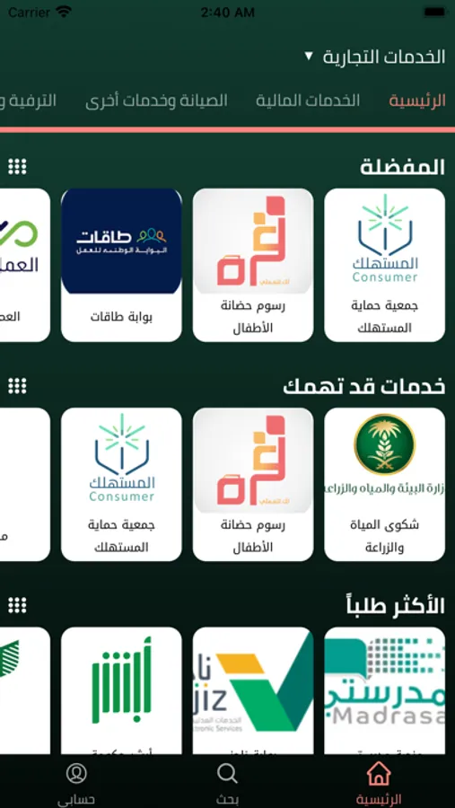 يتكون التطبيق من قسمين رئيسين هما ( الخدمات الرسمية ) و (الخدمات التجاريه ).