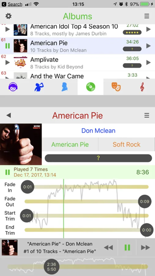Playlist Lab allows cross-fading between tracks. It has a unique auto-crossfade-time feature that finds quiet sections at the beginning and ending of tracks and brings them together for seamless playback. You can manually adjust the automatic crossfade times. See the loudness-vs-time curve for each track.