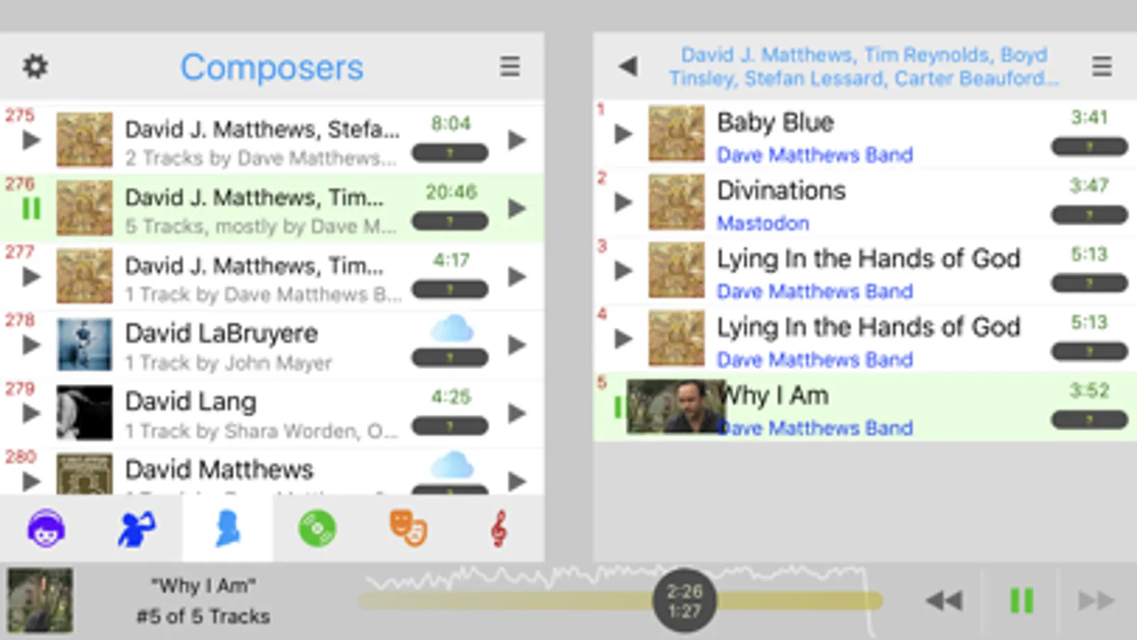 • Display lists of tracks of any artist, composer, or genre, creating playlists from them with a single command.