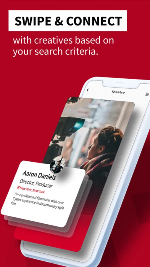 Find creatives and experts in your fields or other fields. Cast Meet Crew shows you the people you want to connect with and allows you connect by a mutual right swipe. Add filters such as union, age range, distance, spoken languages etc. to find matching creatives.