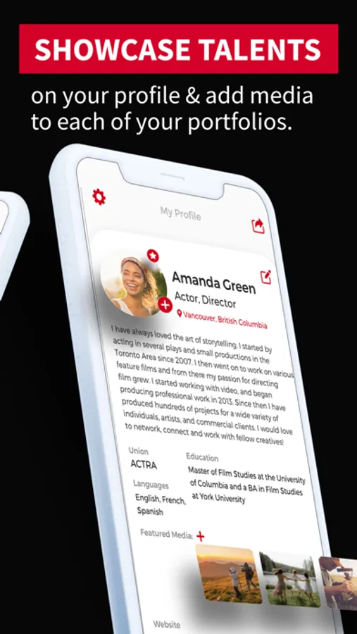 Add up to 6 Media files to each of your talent portfolios – You can add media from Vimeo, Youtube, Facebook, Instagram, or your phone gallery.