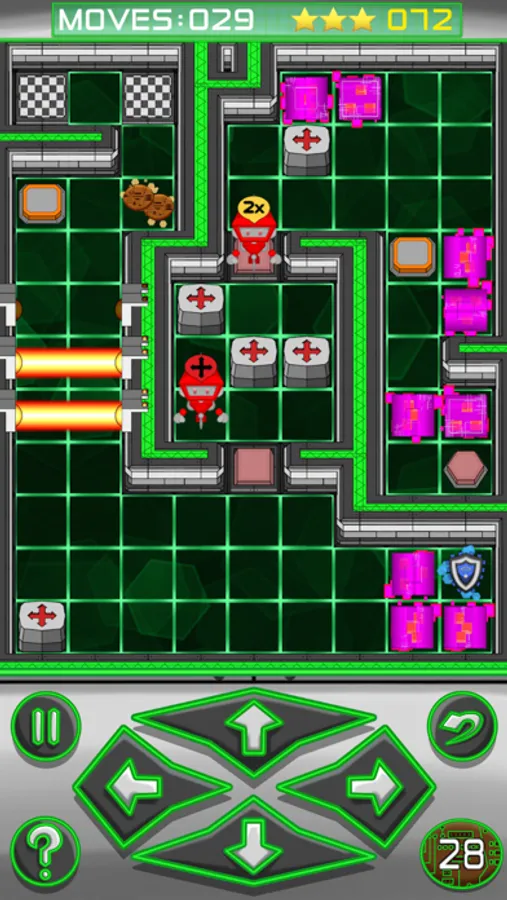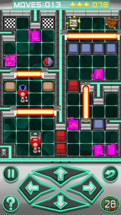 OBIO Bots can collect special power-ups to enhance their abilities! Move two spaces instead of one, block lasers, phase through walls, and more!