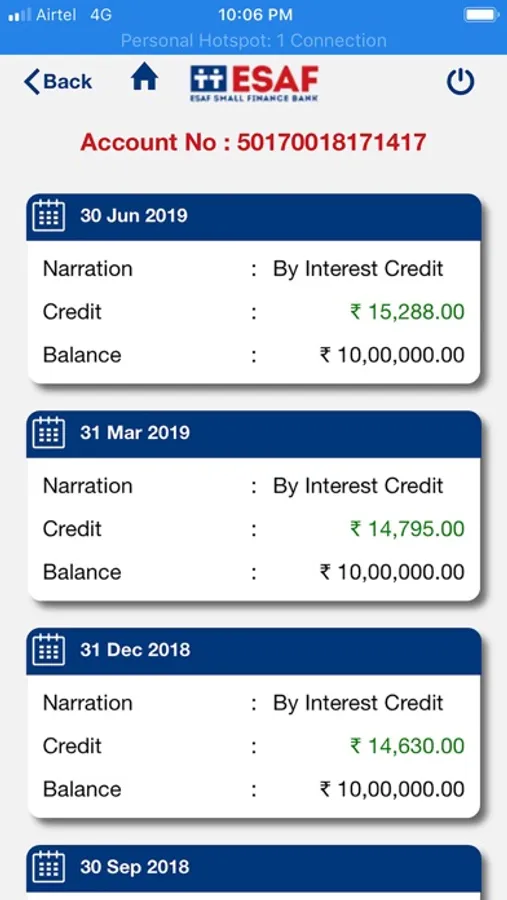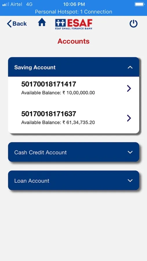 Through ESAF Bank, you can access all your account information including balances and transaction history for your current accounts, savings accounts, cash credit accounts, loans, fixed and recurring deposits. You can also pre-close your deposits online and have funds credited to your selected account instantly.
