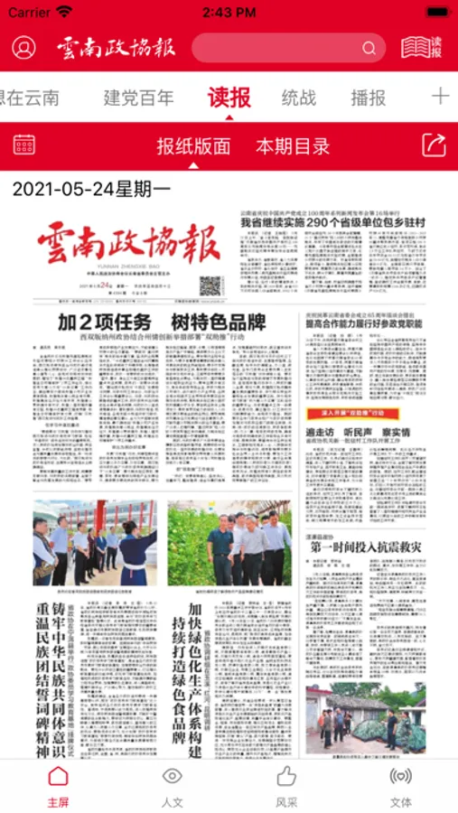 政协组织的宣传窗口,政协委员的精神家园。作为云南省政协的机关报,《云南政协报》是云南省唯一一份面向国内外公开发行的省级大报。在这里,你可以看到全省各级政协及政协组织的工作动态,也可以聆听政协委员心系云岭发展,关注社会民生的拳拳之声。