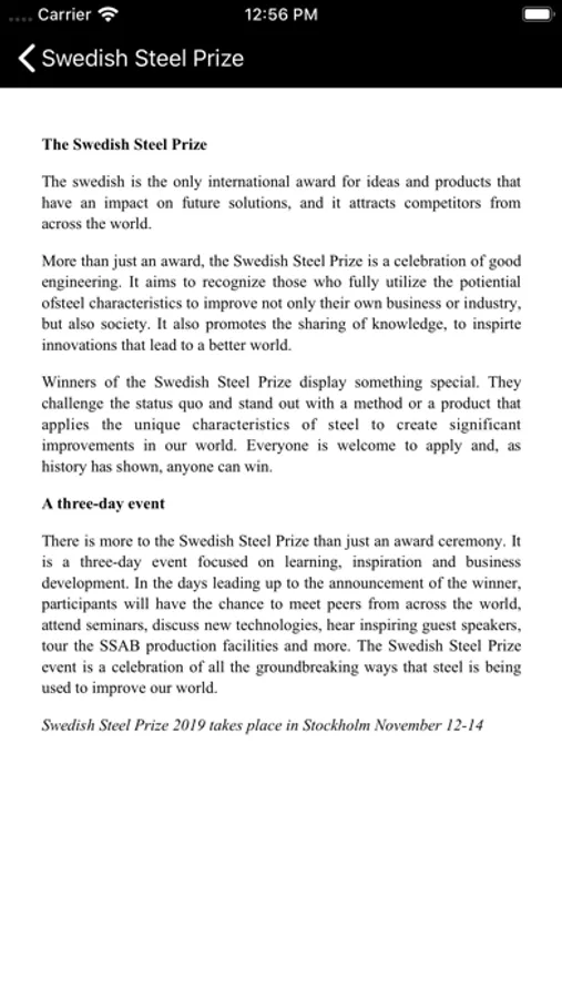 App for participants of the Swedish Steel Prize event. More information about the event at: http://www.steelprize.com/