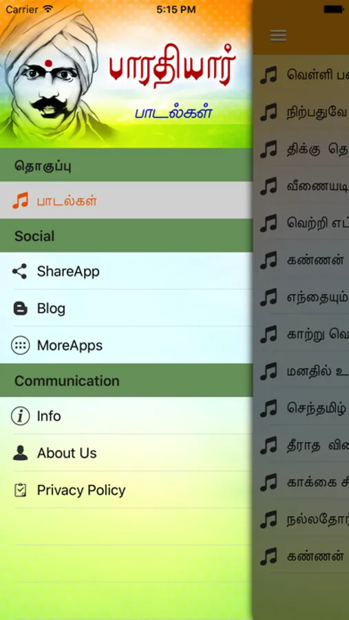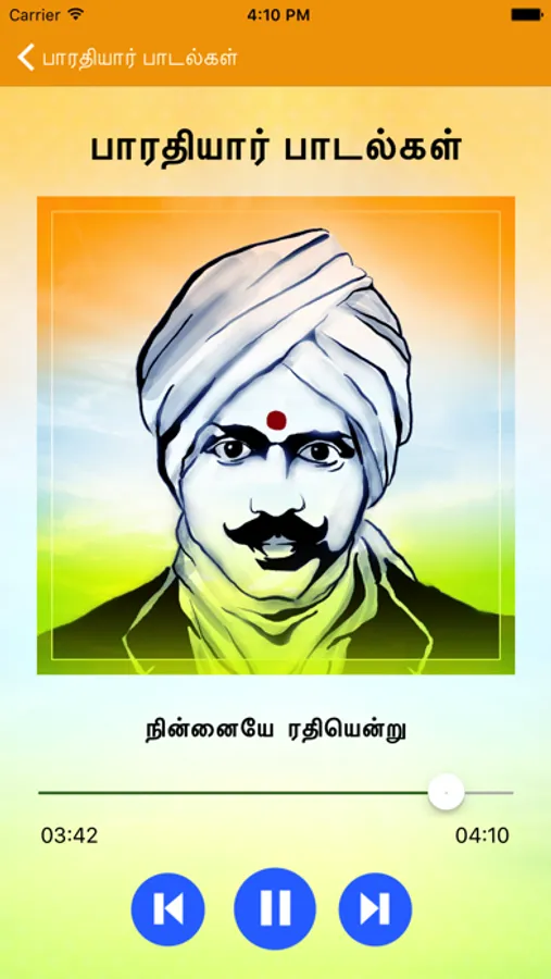 This app is dedicated to the great poet Mahakavi Bharathiyar. The best of poets who will ever continue to inspire millions. This app is a small attempt to digitize ___ of his poems. You can read, enjoy and share the same with your friends.
