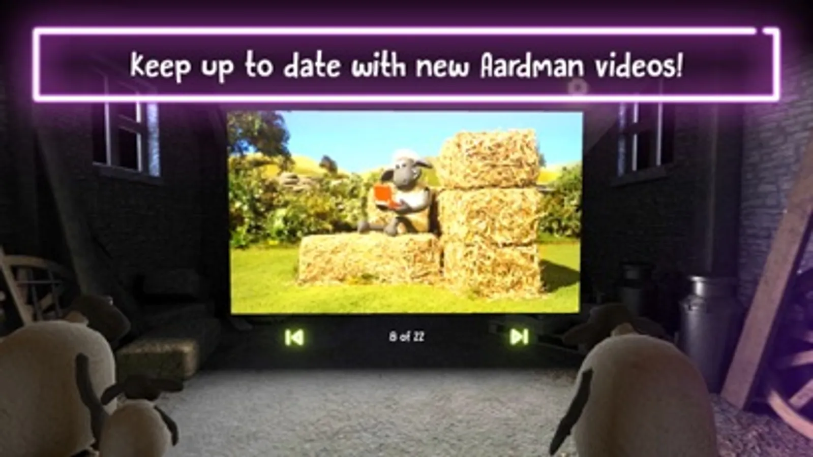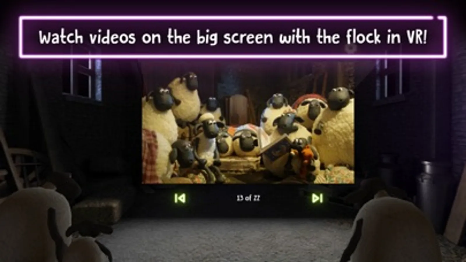 Join Shaun, Shirley, Timmy and the rest of the flock in the barn to watch fun videos on the big screen in VR!
