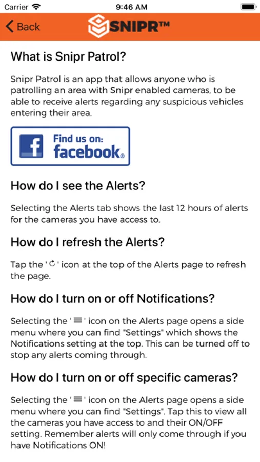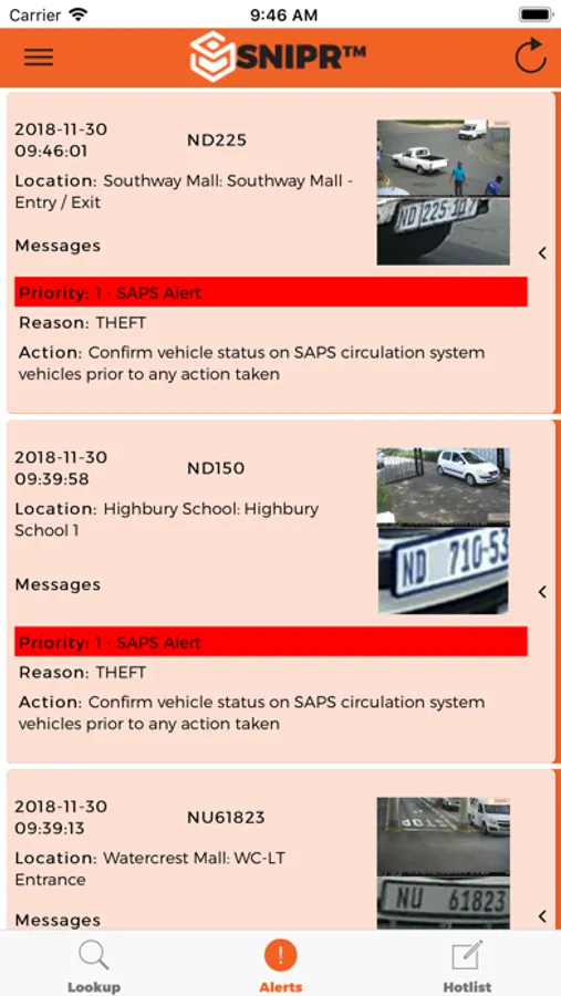 SNIPR PATROL is our Real time Suspicious Vehicle Alert Application and is linked into the SNIPR National Database including the South African Police. When linked to your Community SNIPR enabled Cameras you will receive instant notification of the vehicle, pictures and information about why it was listed. SNIPR has a national Implementation of Cameras through out many communities, you can register your App to receive alerts from any of these provided you are authorized. You can turn on/ off Notification depending on when you are going on Patrol, and you can choose one or multiple Cameras or Areas to receive notification from.