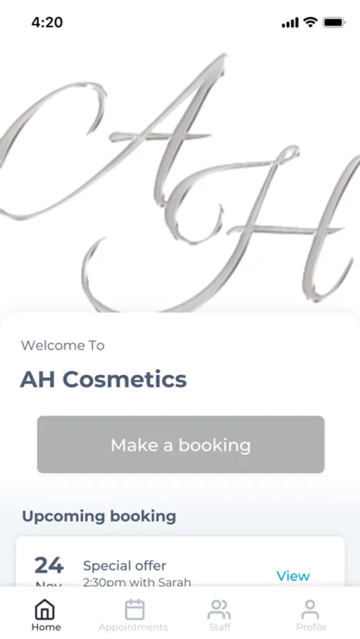 The AH Cosmetics app makes booking your appointments and managing your loyalty points even easier. You're just a few taps away from feeling good and looking great!
