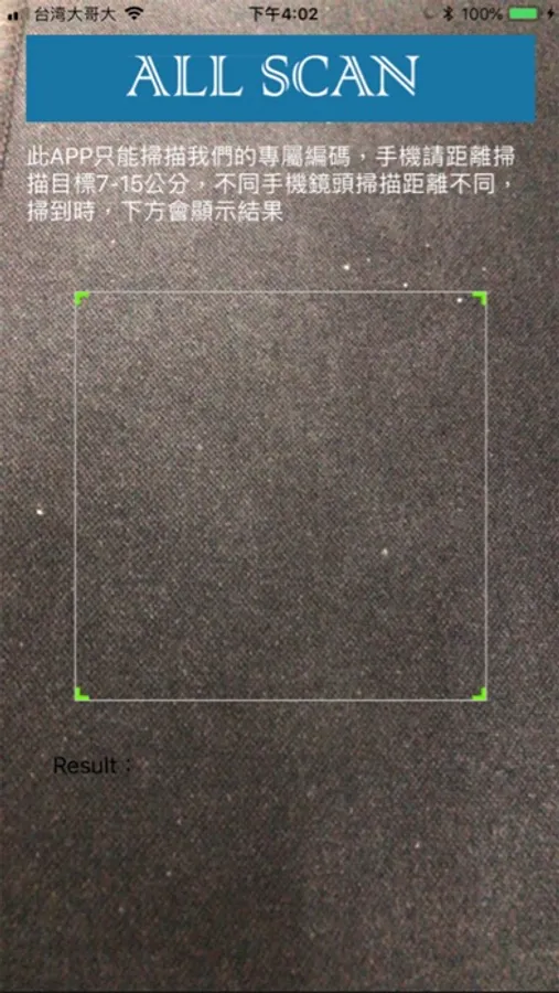 ALLSCAN是針對我們已編碼的產品做手機解碼的APP,只適用於我們的產品,對其它產品沒有作用,此APP只能掃描我們的專屬編碼,手機請距離掃描目標7-15公分,不同手機鏡頭掃描距離不同,掃到時,下方會顯示結果!
