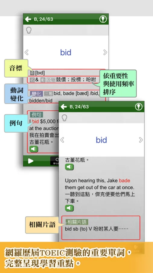 3. 單字與例句均提供發音,例句貼近實際考試內容,讓你在學習過程中自然掌握考題走向,為閱聽與聽力加分。