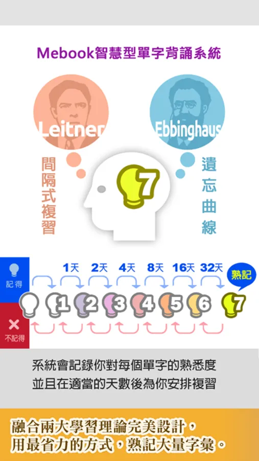 1. 兩大學習理論,完美實現:採用艾賓豪斯「遺忘曲線」與萊特納「間隔式複習」兩大理論所設計,協助背誦者能在記憶曲線的最佳時段進行英文單字的背誦與複習,讓所學的單字都能達到長期記憶。
