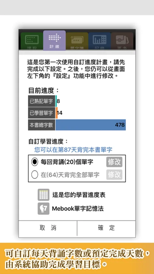 4. 自訂學習進度:可依每天背誦字數或預定完成天數擬定計畫,系統將自動換算可完成的天數或每天需背誦的單字數,協助您完成學習目標。