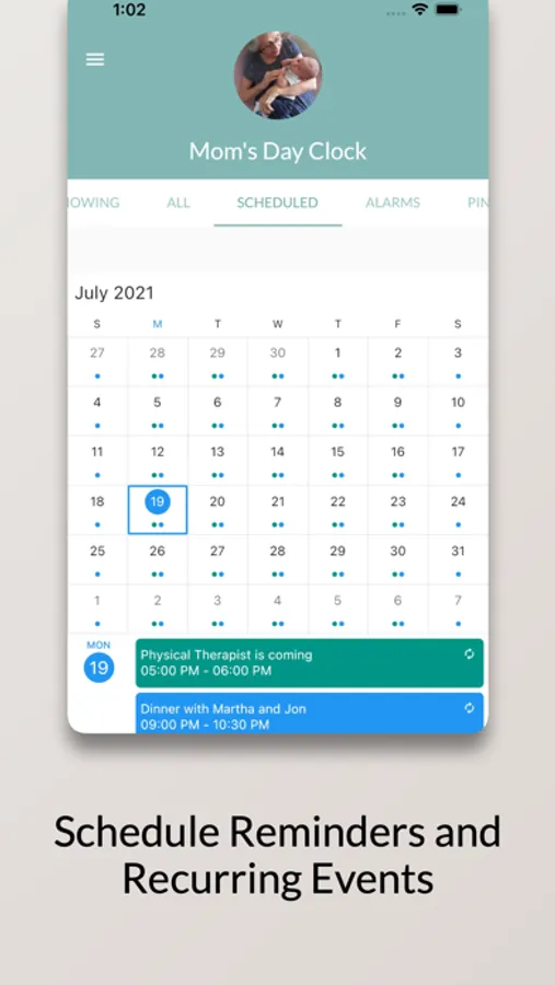 Unlike other calendar apps, by setting daily/hourly reminders and alarms, RecallCue serves as an extremely helpful dementia help tool by calling attention to important events including doctor visits and appointments, meal times, birthdays, upcoming events, wake-up calls, and more.