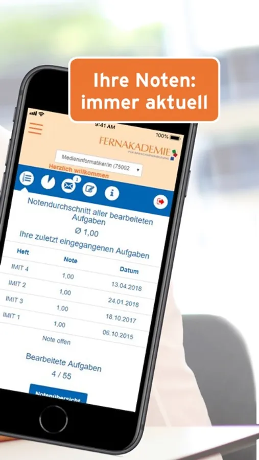 Mit einem Klick alles im Blick: Die Fernakademie-App ist der ideale mobile Zugang zu den wichtigsten Funktionen des Online-Studienzentrums (OSZ), mit der tagesaktuellen Notenübersicht auf der Startseite. Die einmalige Anmeldung mit Ihren OSZ-Zugangsdaten in der App genügt.