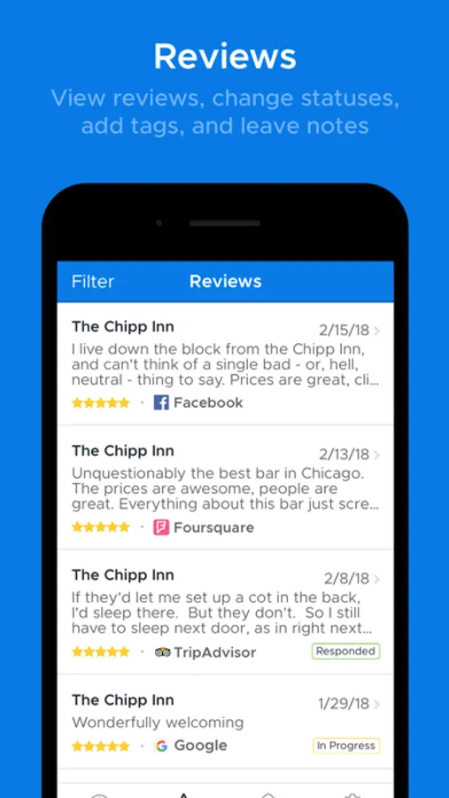 Download the ReviewTrackers app today to filter reviews by rating or source, respond in the app to Google and Facebook reviews, or share reviews and customer feedback. All from the convenience of your mobile device.