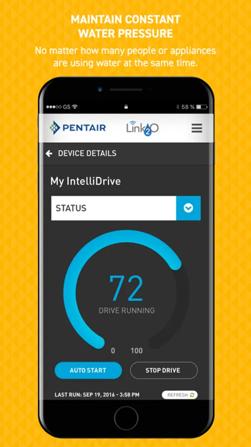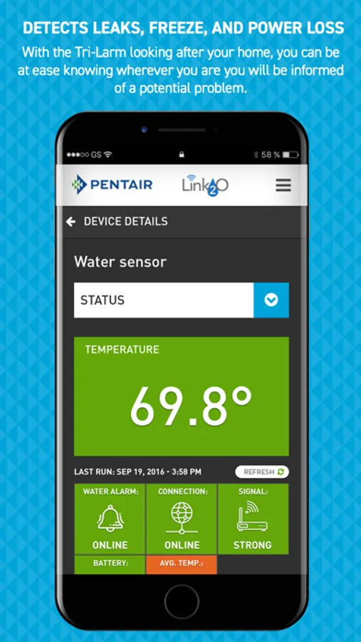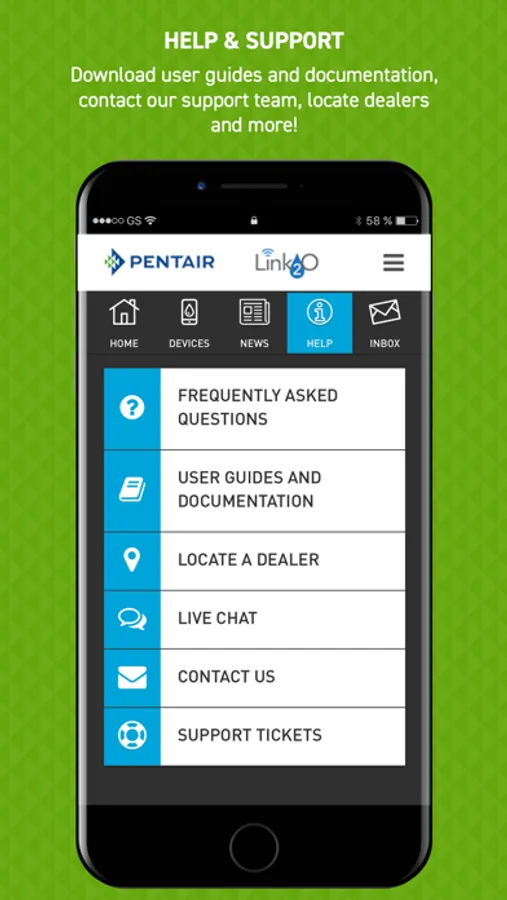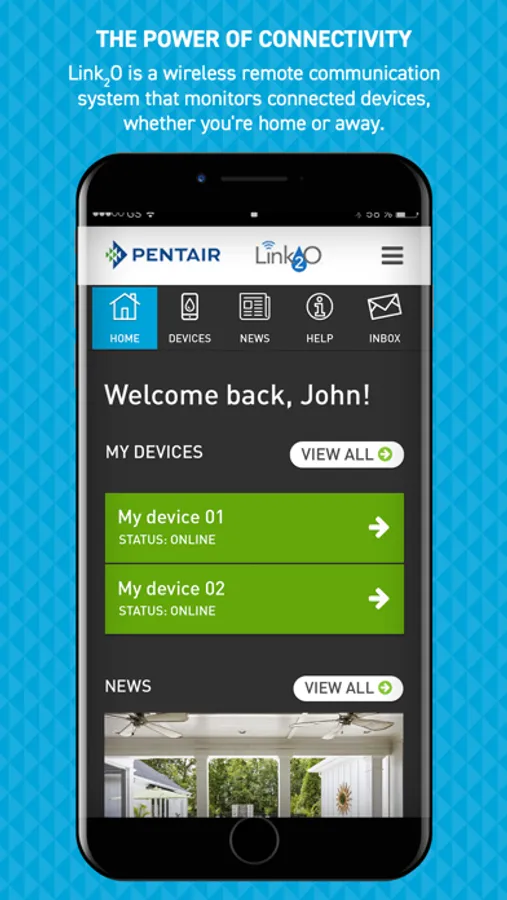 The Link₂O system allows users the ability to monitor, control, and turn off devices, view product resources, and receive alerts from installed Pentair devices. These features provide easy, better, and more convenient ways to control installed devices from anywhere. Compatible devices include PENTEK INTELLIDRIVE™, sump pump battery backup, water sensors, and IntelliConnect®.