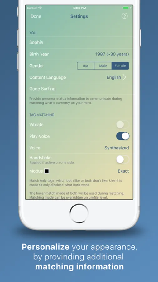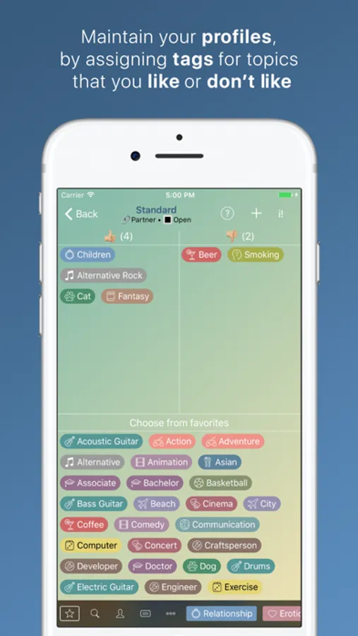 Maintain your profiles by assigning tags for topics you like or you don’t like. Match your profiles with other people when you meet physically.