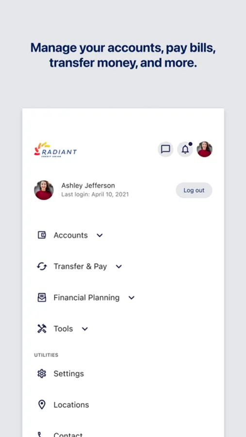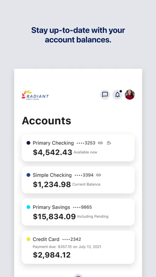 Manage your accounts, pay bills, view copies of your cleared checks, and view transaction history. Members can also make quick transfers within Radiant accounts and find the closest ATM in Radiant’s network.
