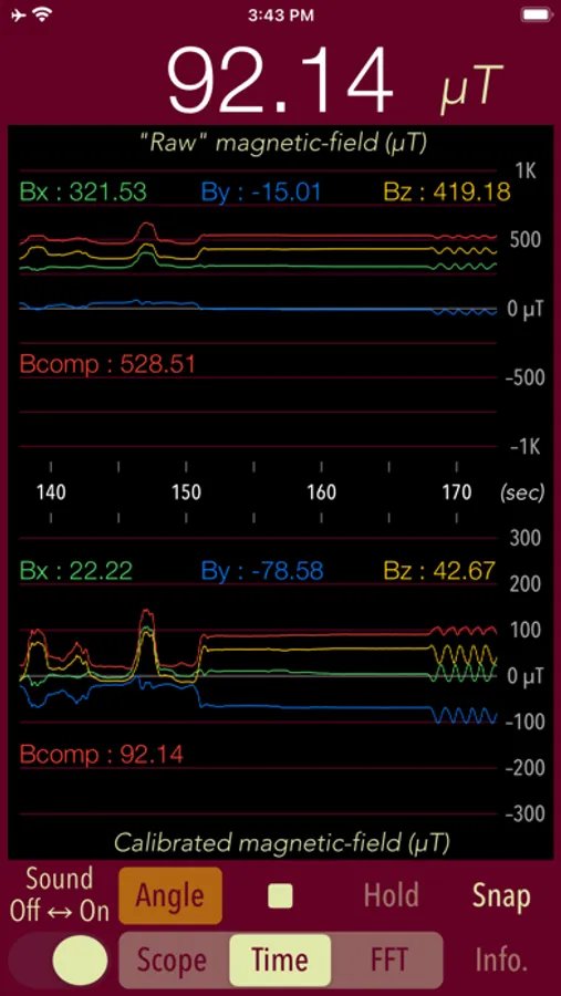 Trace the RAW data from the magnetic sensor and its corrected data. It is a time displacement graph of each axis value (Bx / By / Bz) and composite magnetic flux density (Bcomp) in three-dimensional space. You can scroll up to 180 seconds.
