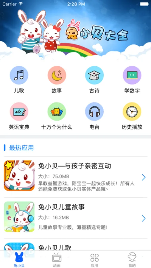 【兔小贝大全】是兔小贝的家长应用中心,专为0~8岁儿童的兴趣与爱好研发一系列免费动画视频,还有益智小游戏等,在这里不仅能与百万家长互动育儿经,还能为孩子选择各种有趣的手机应用。