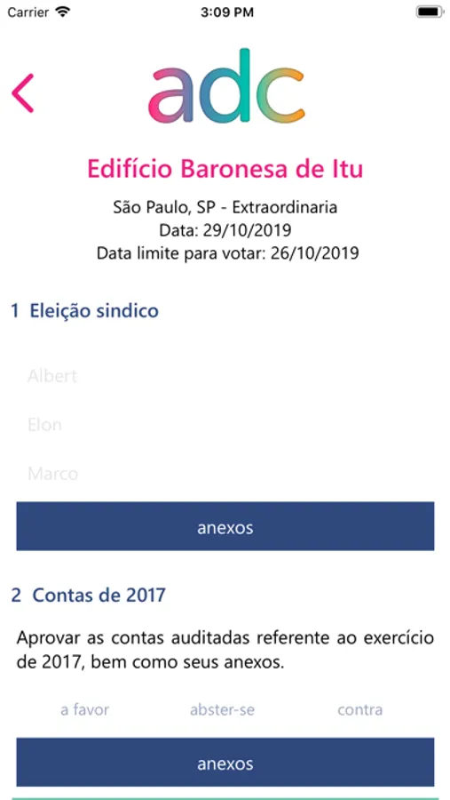 sobre adc: Inovador e simples de usar, o aplicativo adc foi pensado para quem quer exercer o voto em qualquer tipo de assembleia, sem abrir mão da comodidade por meio de um aplicativo independente e seguro. O aplicativo consegue, também, registrar diversas assembleias para o mesmo usuário, ou seja, o usuário pode votar na assembleia de acionistas, assembleias condominiais, assembleias de debenturistas, entre outras por meio de um único aplicativo. A adc é uma empresa independente na prestação de serviços de voto e auxilio ao voto em vários tipos de assembleias via aplicativo. A adc preza pela ética, transparência, segurança da informação e pela comodidade de seus clientes. A adc tem como prioridade a democratização e a ampliação da participação nas assembleias.