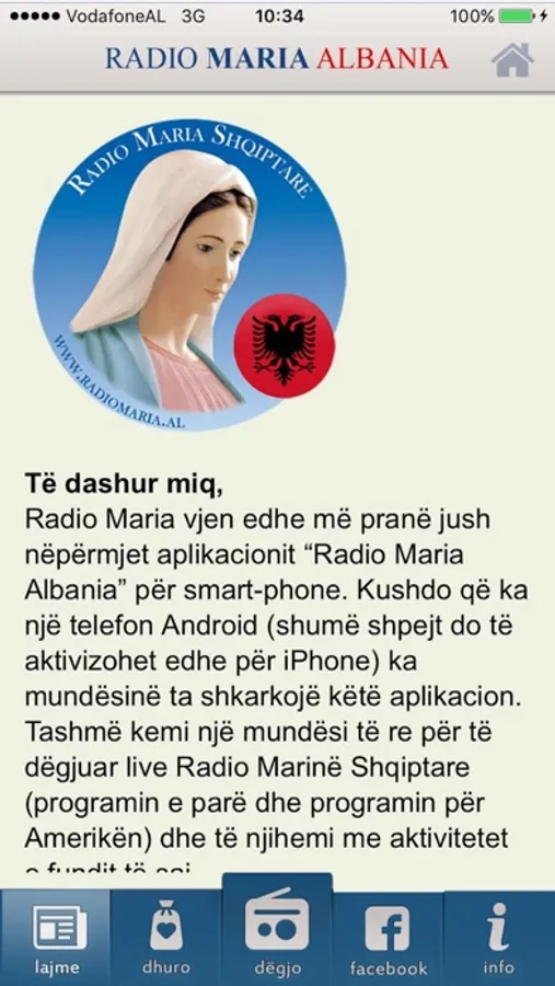 "Radio Maria Albania" është një mundësi e shkëlqyer për të dëgjuar drejtpërdrejt Radio Marinë (programin kryesor dhe programin për Amerikën) dhe për tu informuar për aktivitetet e saj. Në këtë aplikacion mund të gjeni çdo ditë Liturgjinë e Orëve, Liturgjinë e Fjalës dhe informacione të dobishme që na ndihmojnë të lutemi e të jemi të krishterë të mirë.