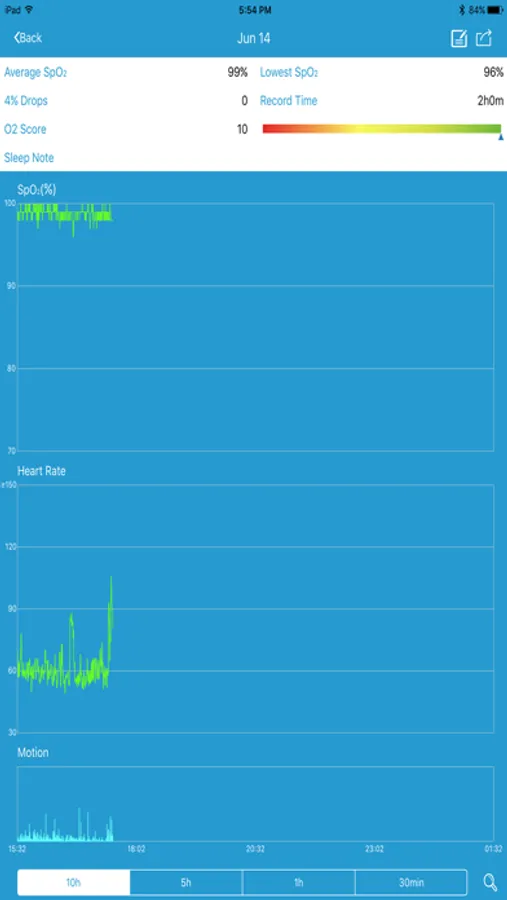 - Graphic sleep report includes analysis results, plots of oxygen level, heart rate and motion