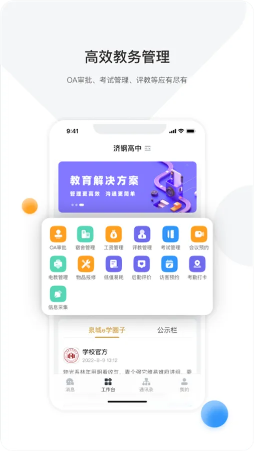泉城e学整合家校共育、学业诊断、即时沟通、课程表、工作台等功能于一体,覆盖教、学、研、评、辅、管、服全教育场景,对教学、教研、行政管理等全过程的数字化升级,让教与学更简单,管理更高效。