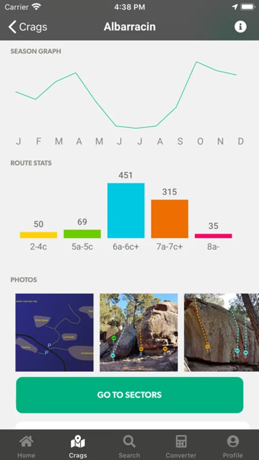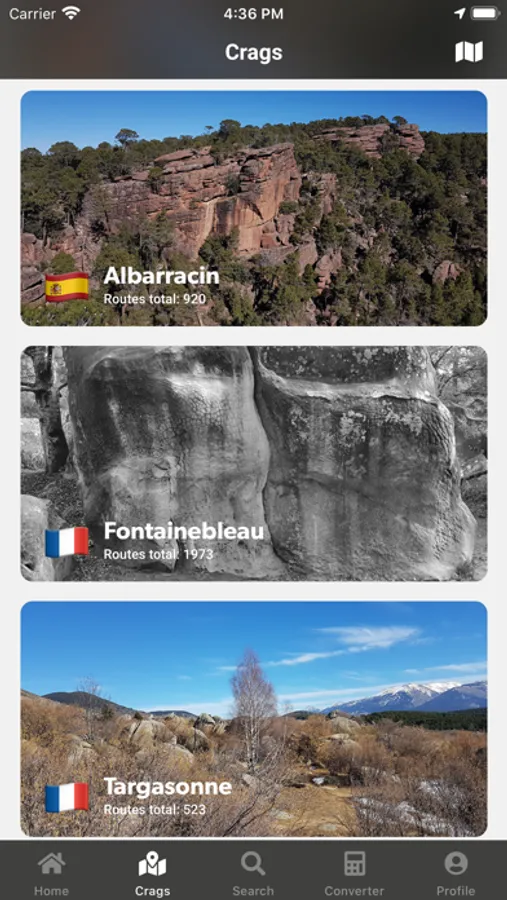 You can browse through available crags either from by map view or from a comprehensive country list.