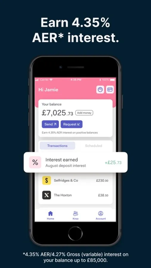 With a Kroo current account, you’ll earn *4.35% AER/4.27% Gross (variable) interest on your current account balance up to £85,000. And it’s paid into your account monthly.