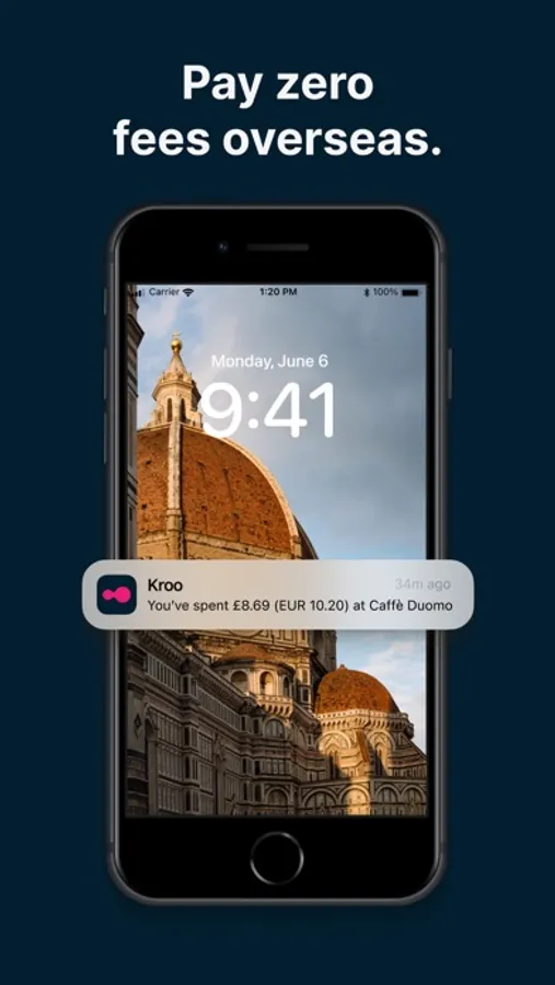 Spend using your Kroo debit card at home and abroad, where Visa is accepted, with zero fees.