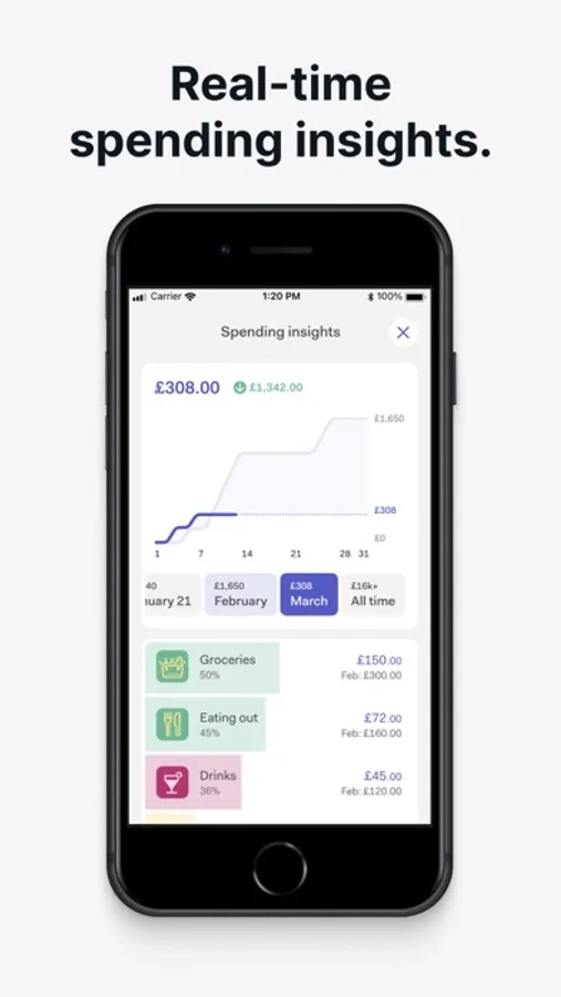 One home for your money. Spend. Track. Settle up with friends. You’ll also get real-time spending insights. These break down and categorise your transactions. Lovely.