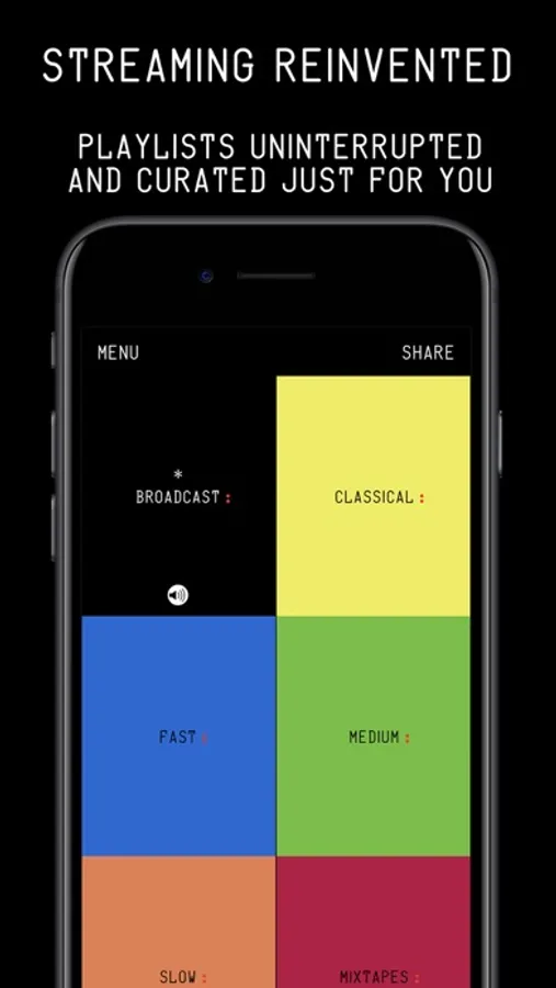 Broadcast is a live stream and Classical, Fast, Medium and Slow do what they say on the tin; that is, offering carefully curated music suitable to each category. In the Mixtape’s section you will find Mixtapes that have been handpicked by DJ’s, film directors, music producers, musicians, artists and tastemakers. Simply click on one and let the music play.