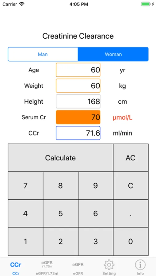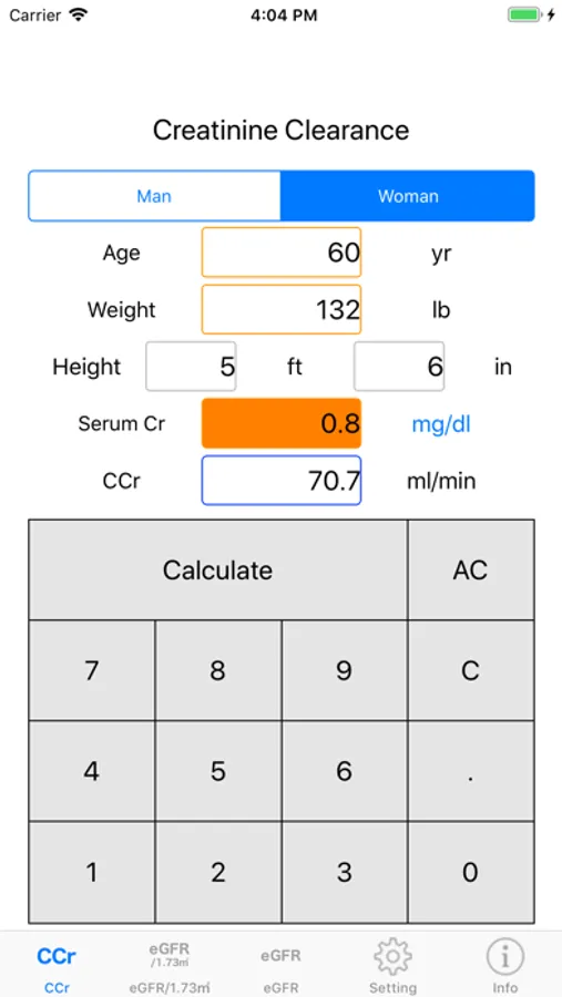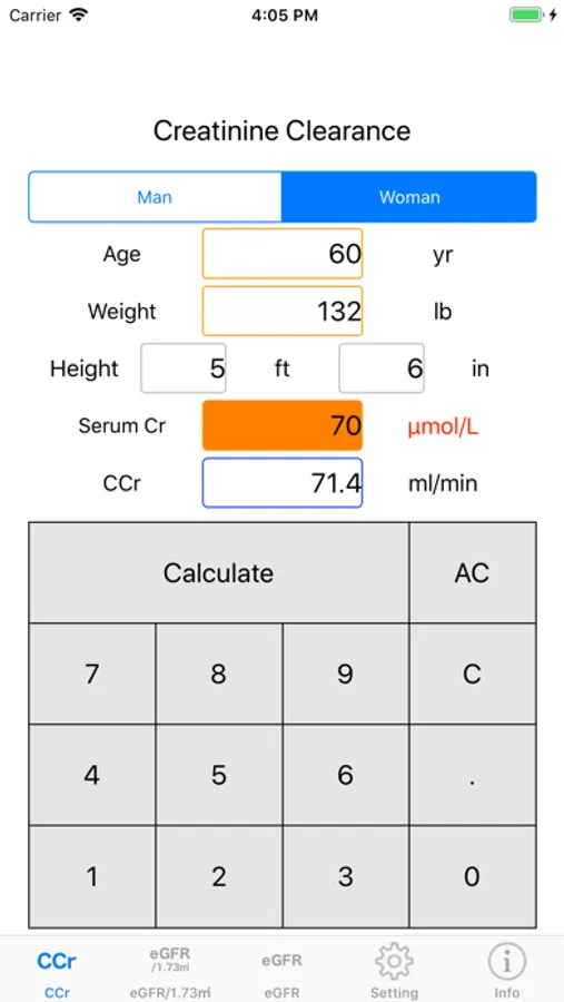 Easy-to-use creatinine clearance and eGFR calculator on a single screen.