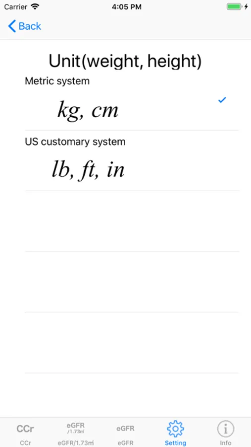 You can select metric (kg, cm) or US Customary Units(lb, ft, inch) as the unit of weight and height.