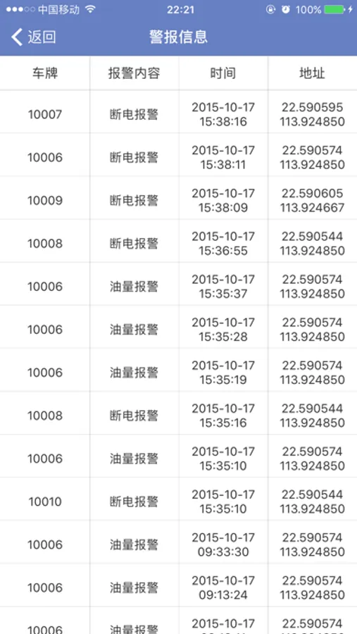 报警信息:获取车辆的报警信息,观察车辆动态信息。