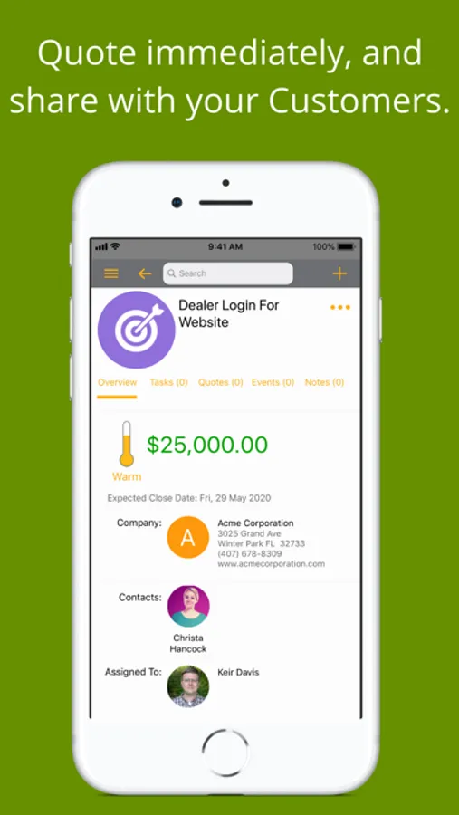 Quickly move through your to-do list by adding a Task or tagging a teammate. Map local Contacts to create efficient sales visits. Move your Customers through the sales process by providing a Quote directly from Haystack CRM.