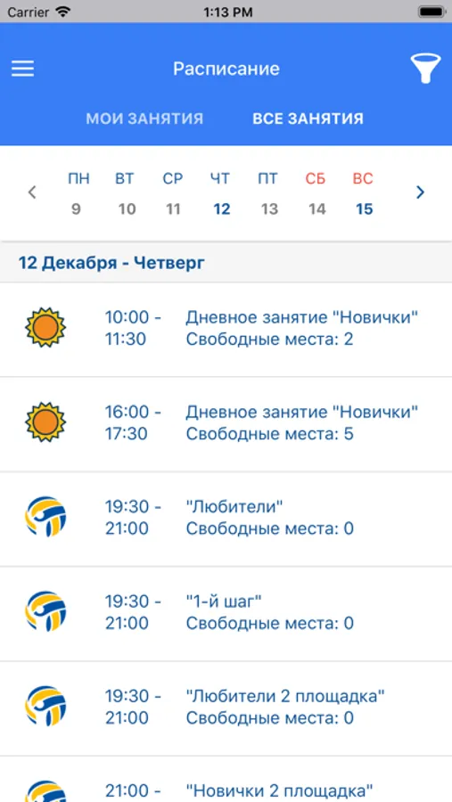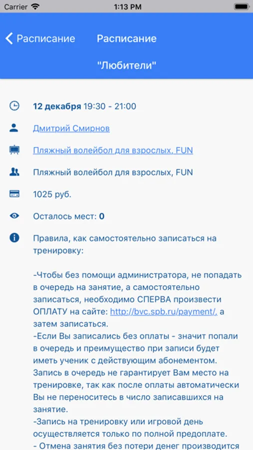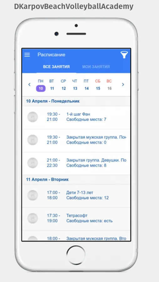 Приложение для самостоятельной записи учеников на тренировки в соответствии с расписанием академии пляжного волейбола Дмитрия Карпова. С возможностью оплаты занятий через приложение.