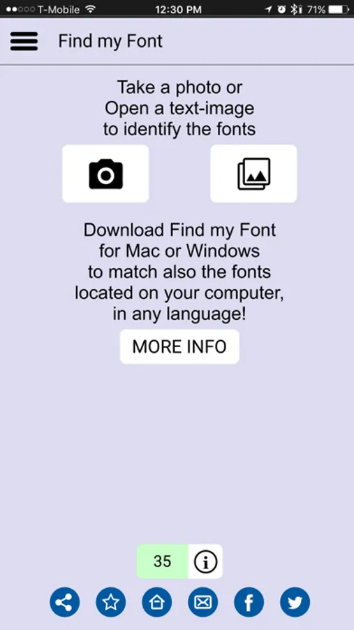 Note: Find my Font mobile, identifies only Latin letters & symbols. For non-Latin letters identification, you can download Find my Font Desktop for your Mac or Windows PC to identify both Latin fonts from our online database and/or any Unicode language fonts stored or installed in your computer (www.findmyfont.com)
